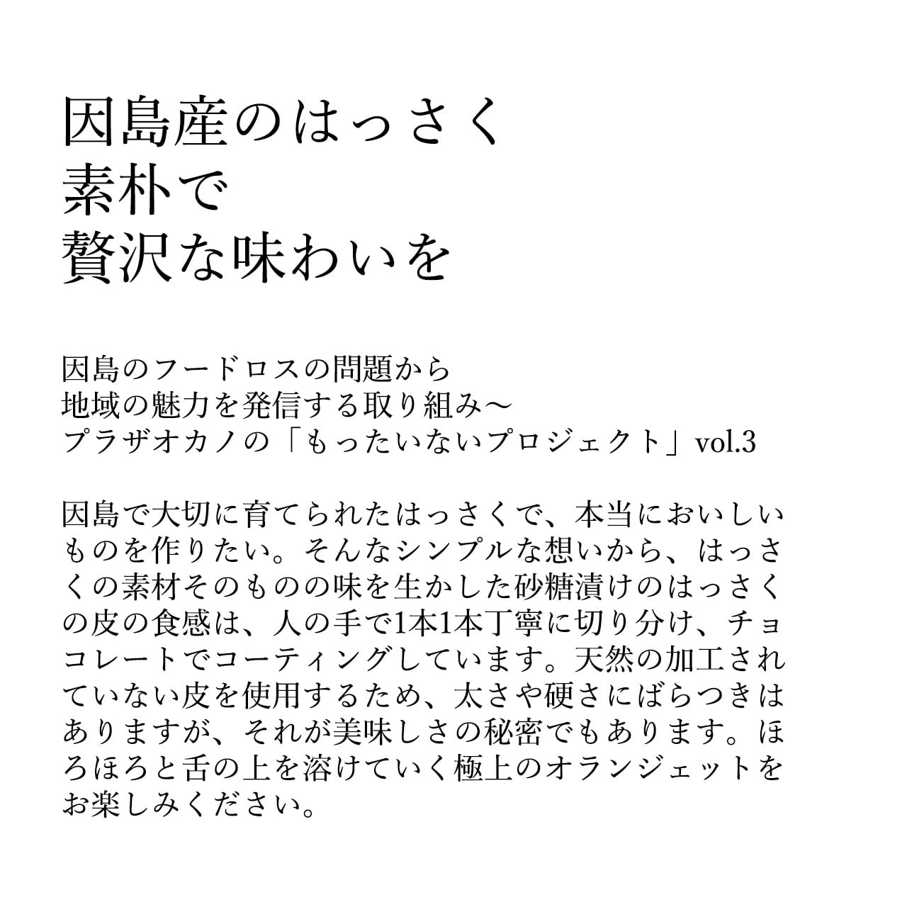 原料 / はっさく(広島因島産)、砂糖、カカオマス、チョコレート、ココアバター、オレンジキュラソー、乳化剤、香料、(一部に乳成分・大豆を含む)